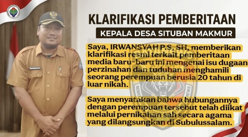 Aceh Singkil — Newsline.id, Kepala Desa Situban Makmur, Kecamatan Danau Paris, Irwansyah Putra Sambo, akhirnya angkat bicara terkait isu yang menyebut dirinya melakukan perzinahan dan menghamili seorang perempuan berusia 20 tahun di luar nikah.