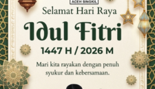 “Atas nama pribadi, keluarga, dan DPRK Aceh Singkil, saya mengucapkan Taqabbalallahu minna wa minkum, shiyamana wa shiyamakum. Selamat Hari Raya Idulfitri 1 Syawal 1447 Hijriah, mohon maaf lahir dan batin,” ujarnya.
